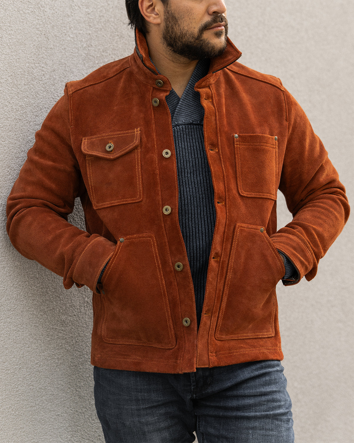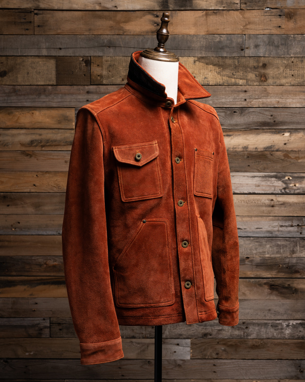 Our reinterpretation of the classic chore coat, the Field Jacket is built from full-grain roughout cowhide in our Copperhide finish. The burnished copper tone, balanced between rust and sun-baked clay, highlights the leather’s natural nap and ensures it will age with character through heavy use.