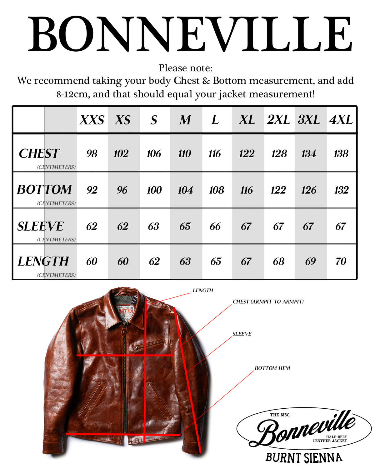 Choosing the right size is simple. Start by measuring your body chest and add 8–12 cm for comfort and natural movement. Then compare that number to the jacket measurements in the chart below.