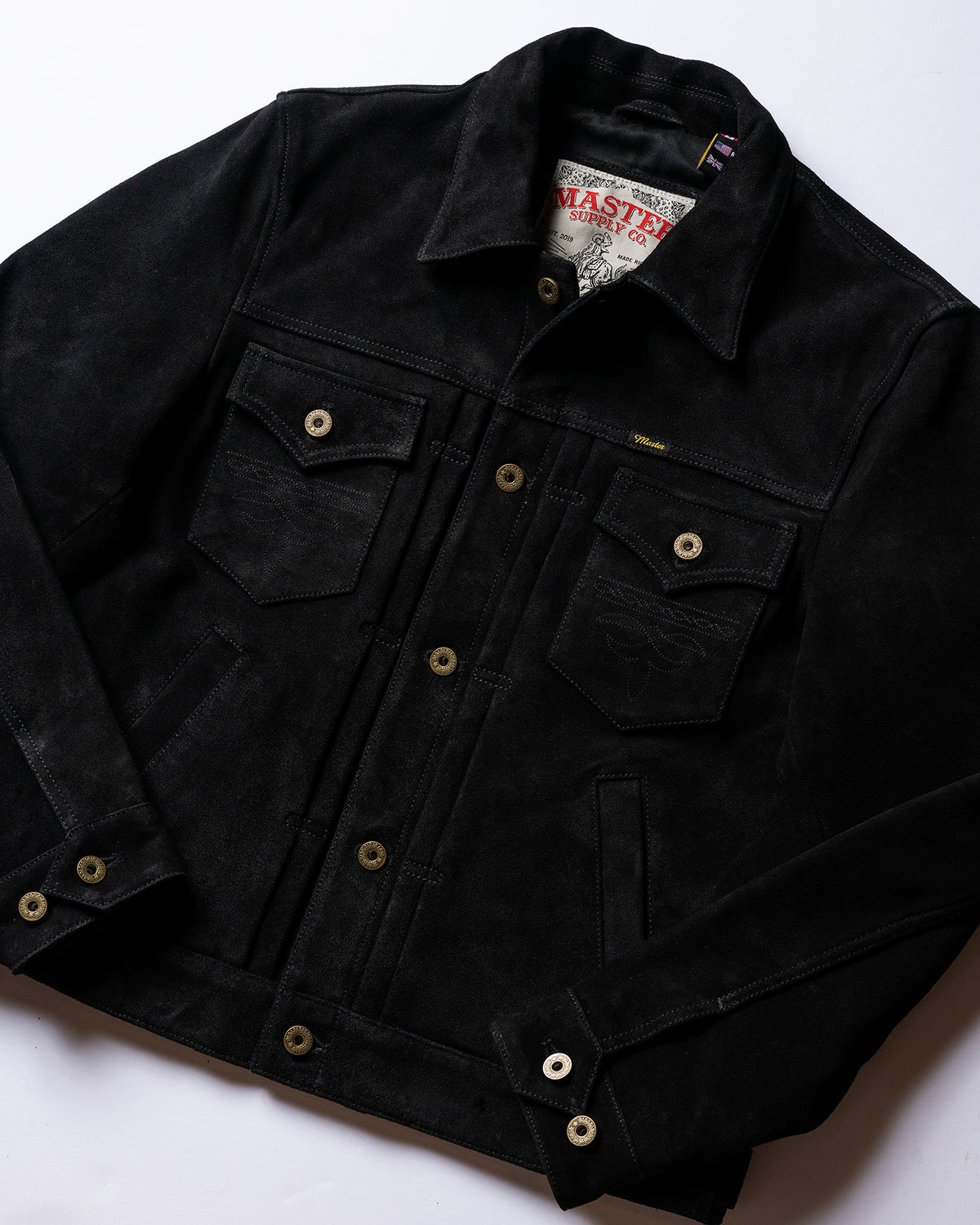 The Convoy: Midnight is built from full-grain black roughout cowhide with a deep, uniform black tone and a low-sheen, matte surface. The roughout finish absorbs light rather than reflecting it, giving the jacket a stealthy, utilitarian look that will develop subtle highs and lows as the nap compresses over time.