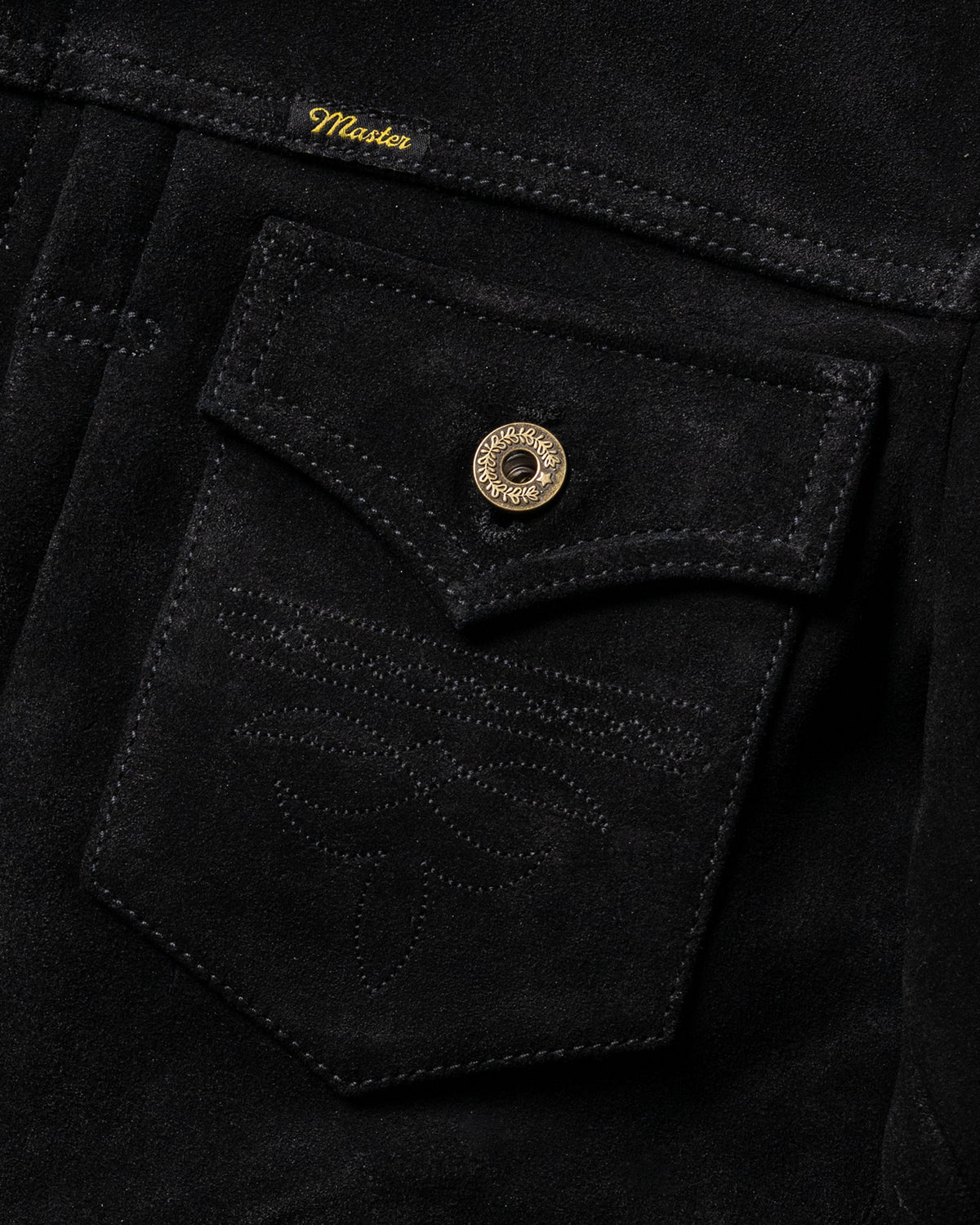 The front features custom solid zinc double-prong donut buttons and two Western-style chest flap pockets with minimal, tone-matched embroidery. A widened upper chest seam allows the collar to sit open naturally, creating a clean roll while preserving the jacket’s sharp profile.